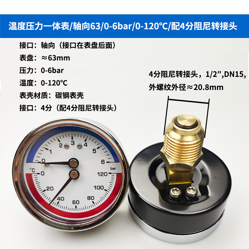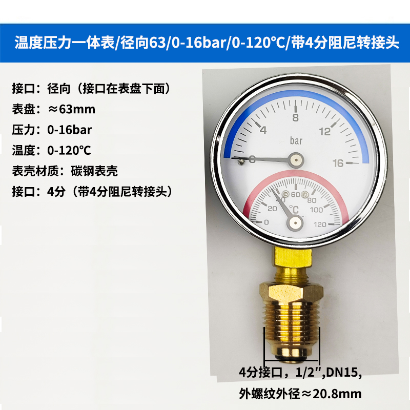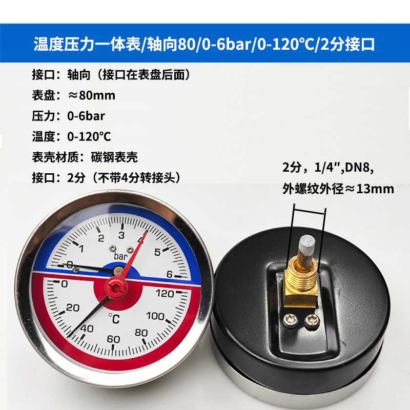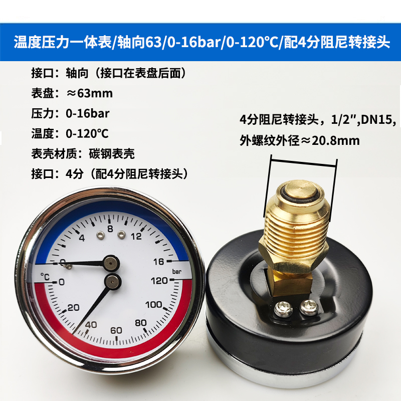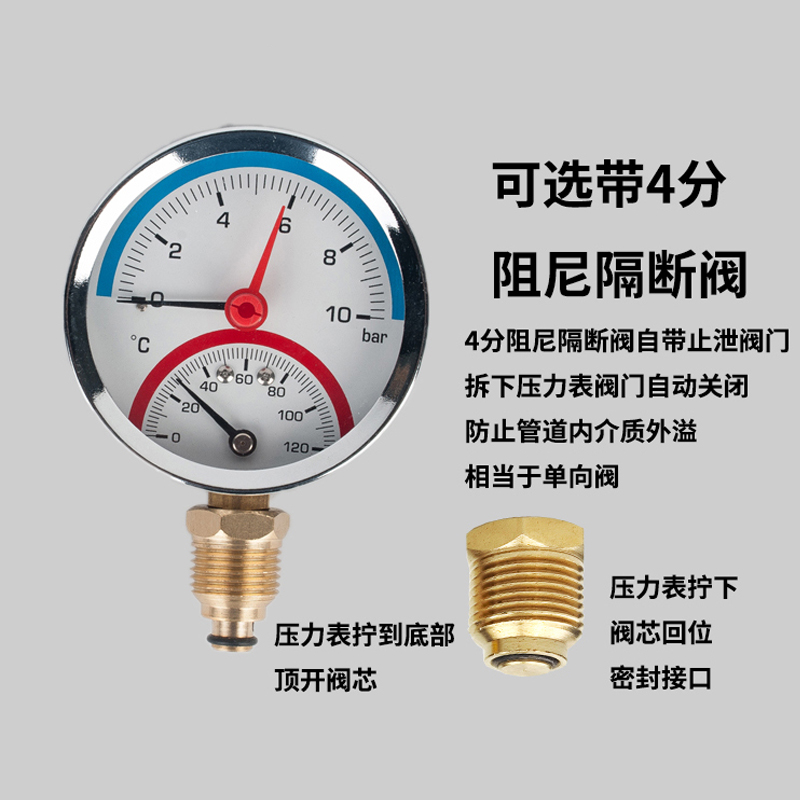 63/80径向温度压力表地暖空调温度压力一体表轴向锅炉水暖温压表