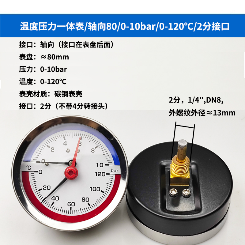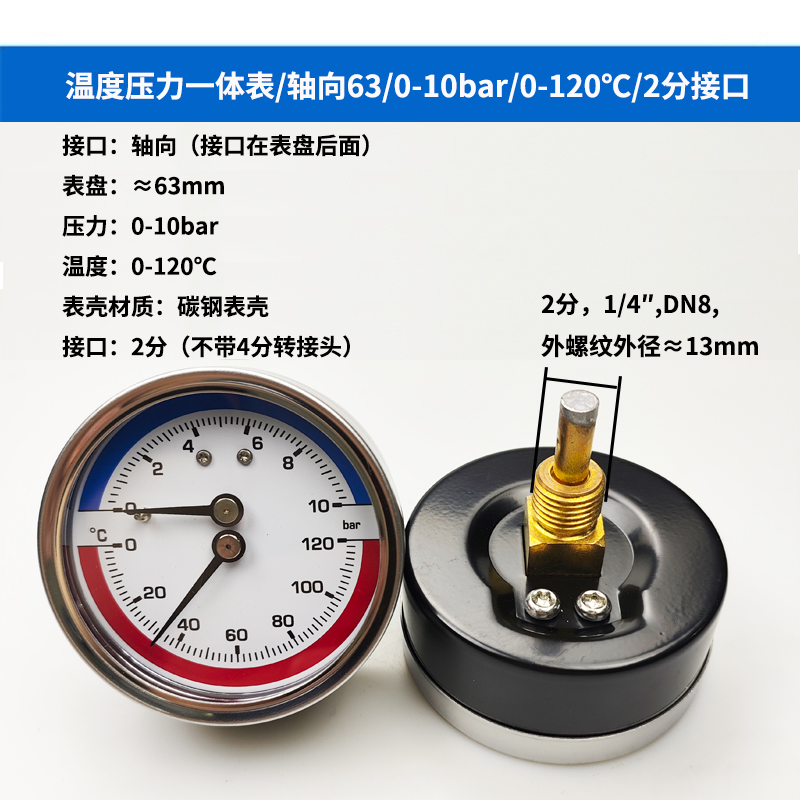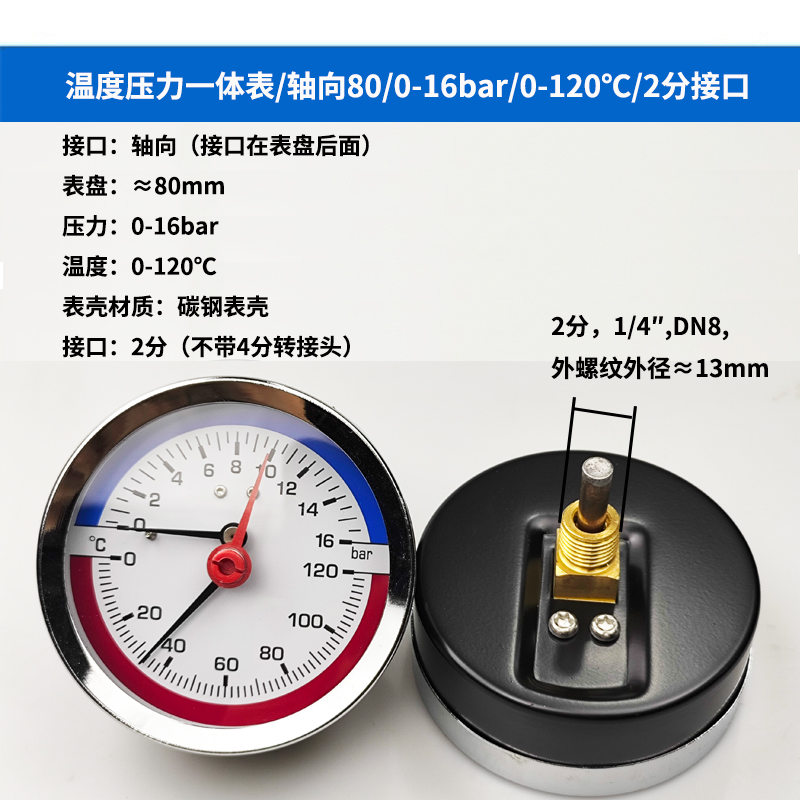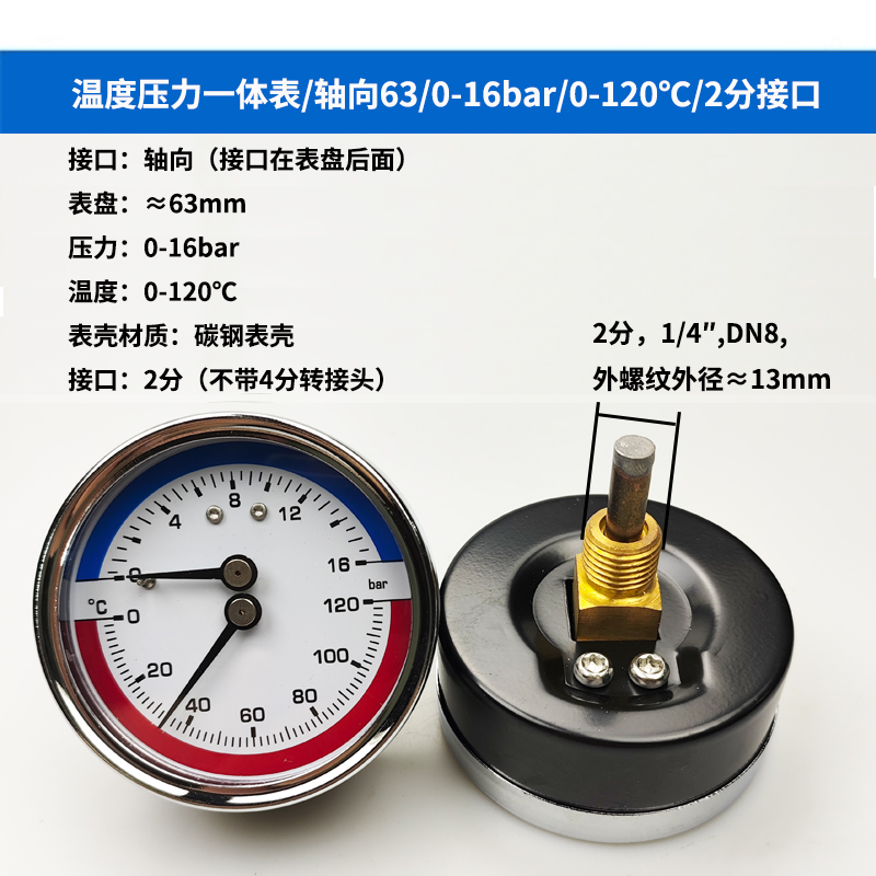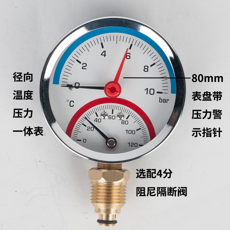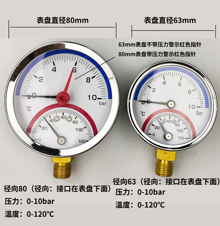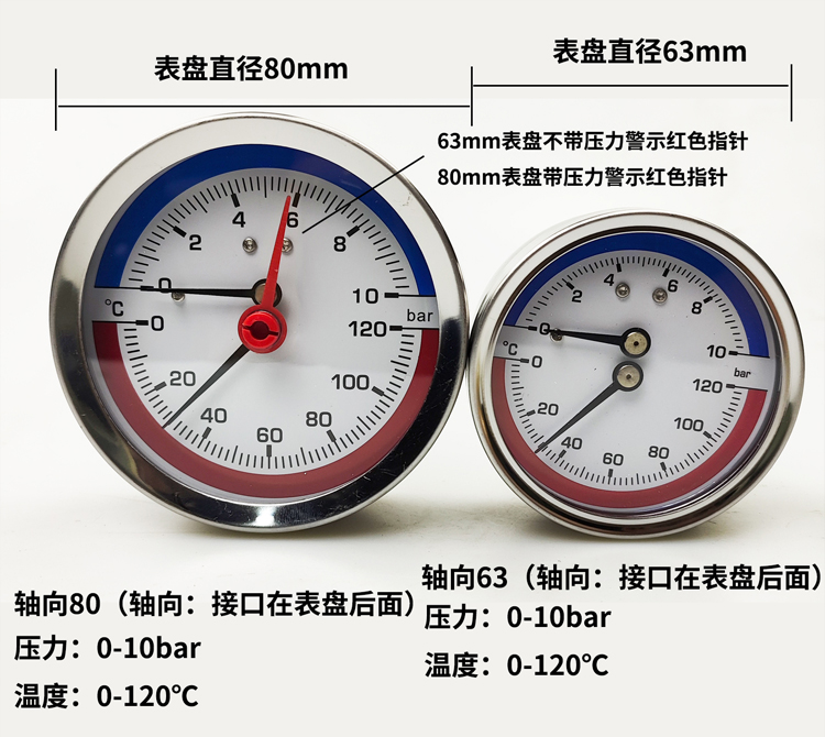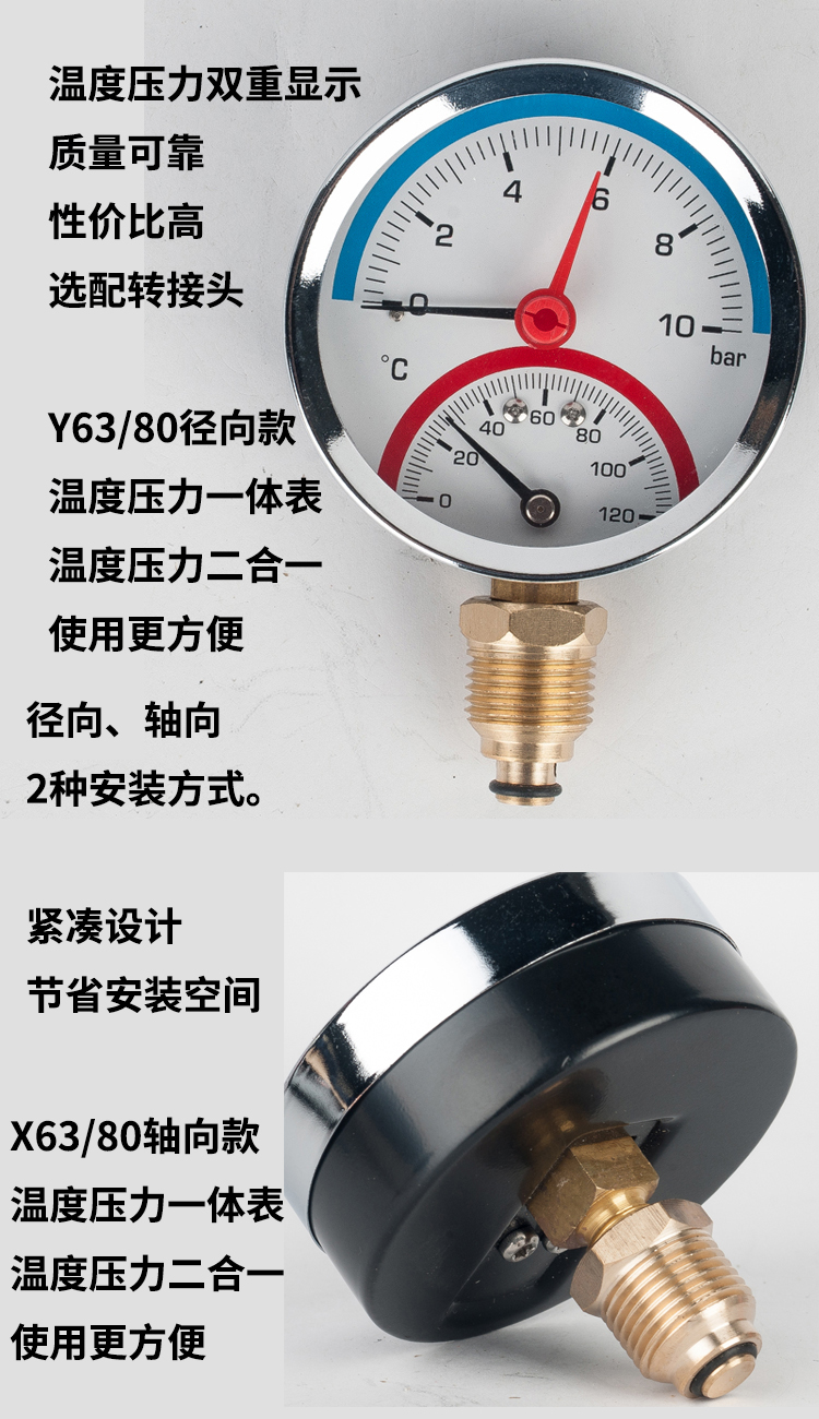 63/80径向温度压力表地暖空调温度压力一体表轴向锅炉水暖温压表