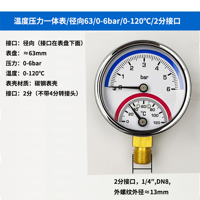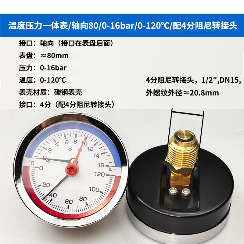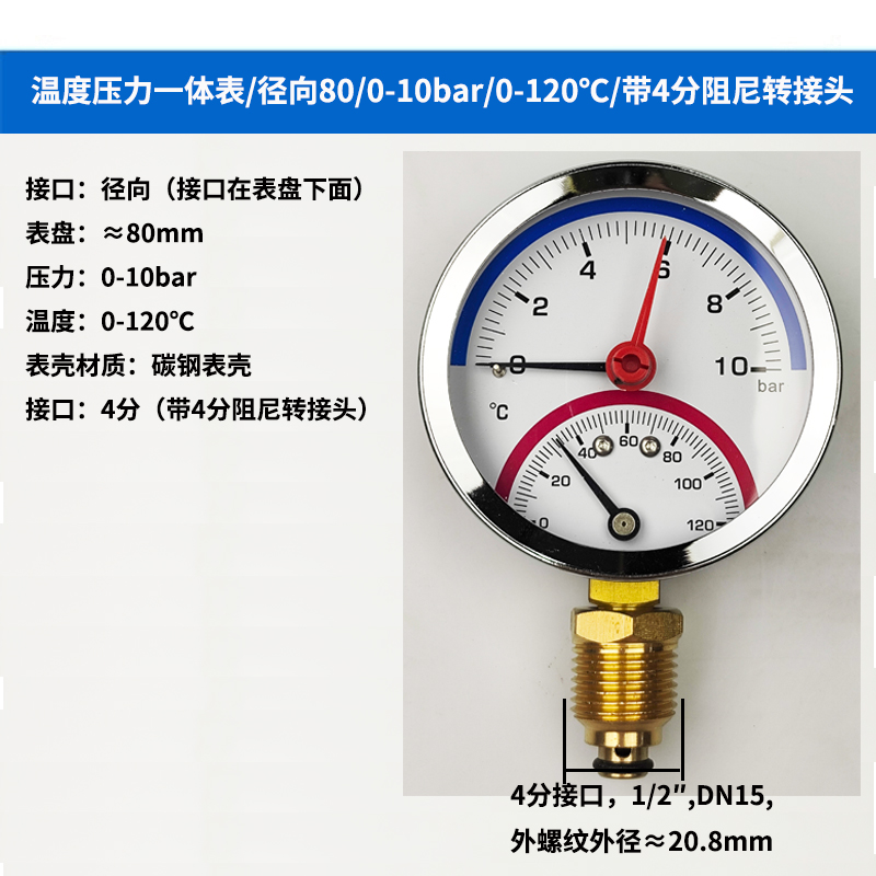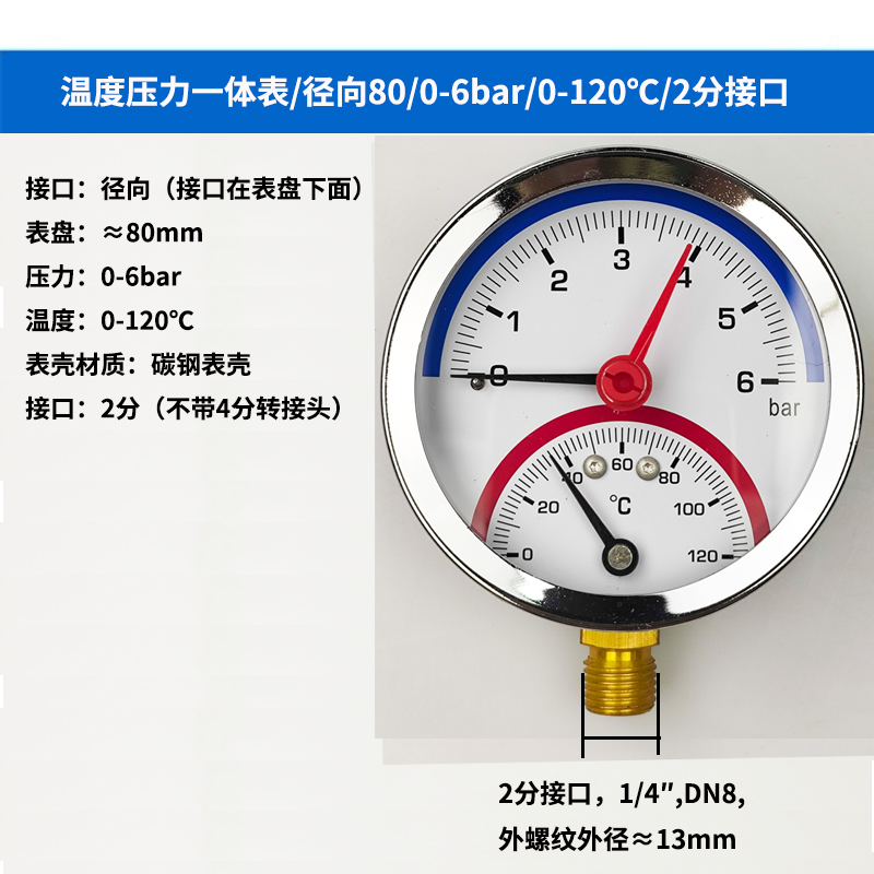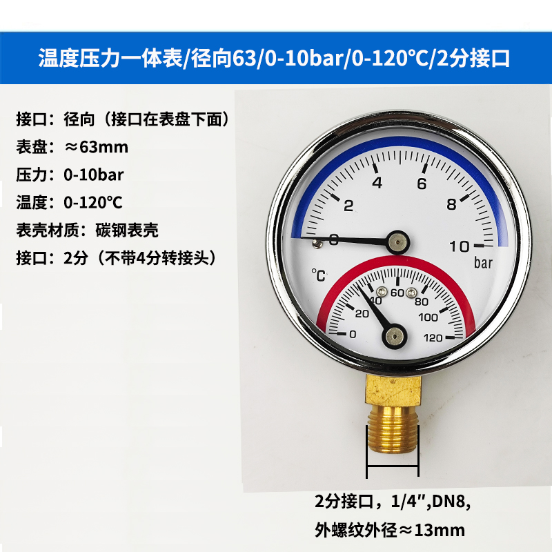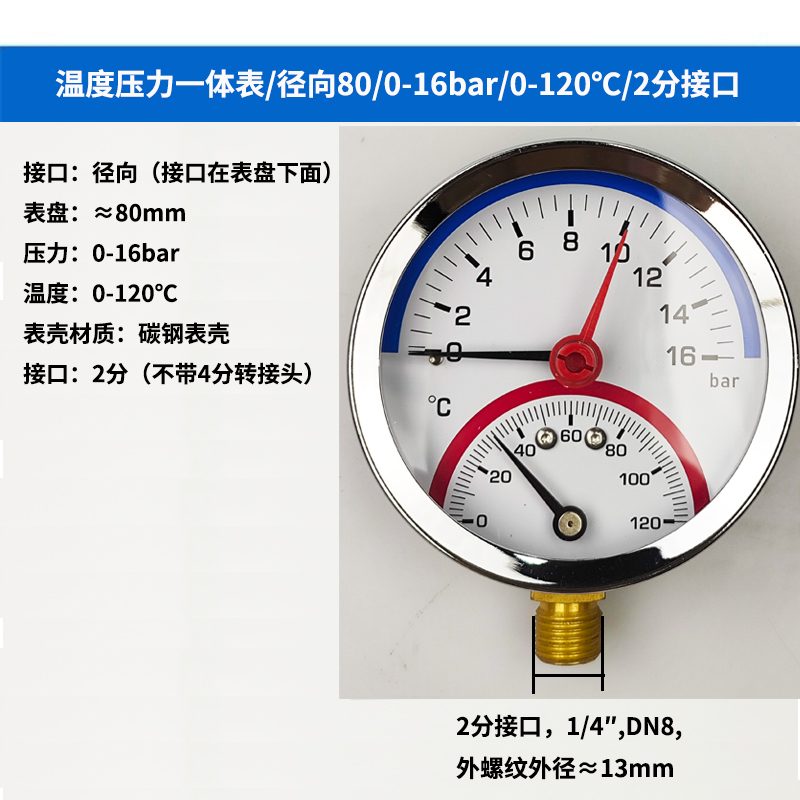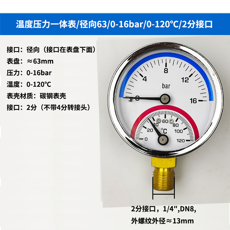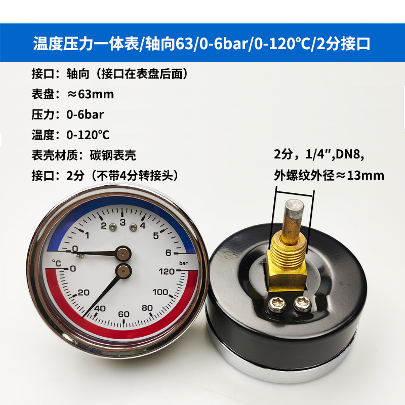 63/80径向温度压力表地暖空调温度压力一体表轴向锅炉水暖温压表