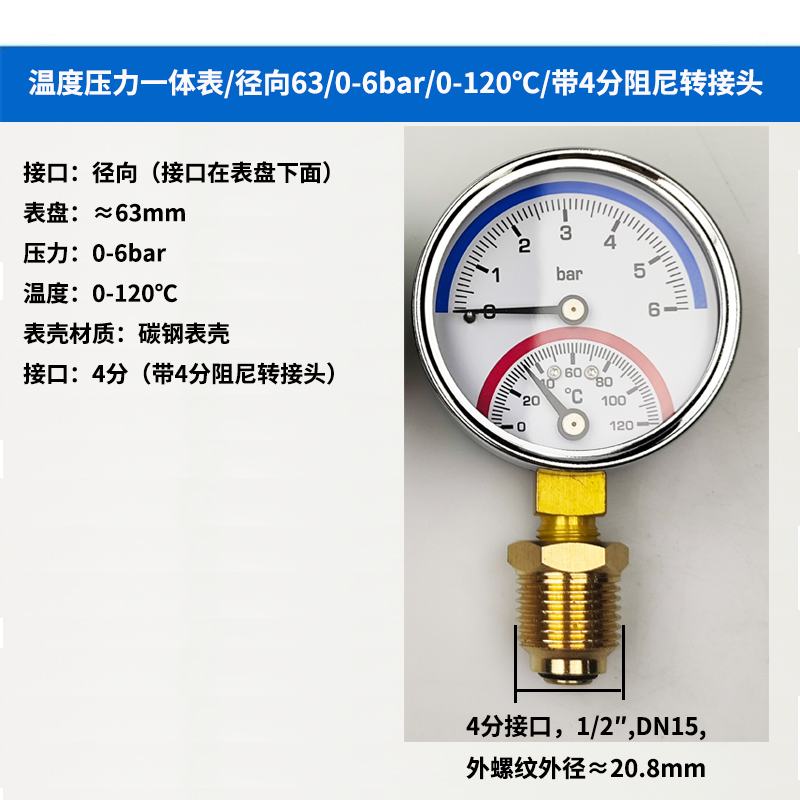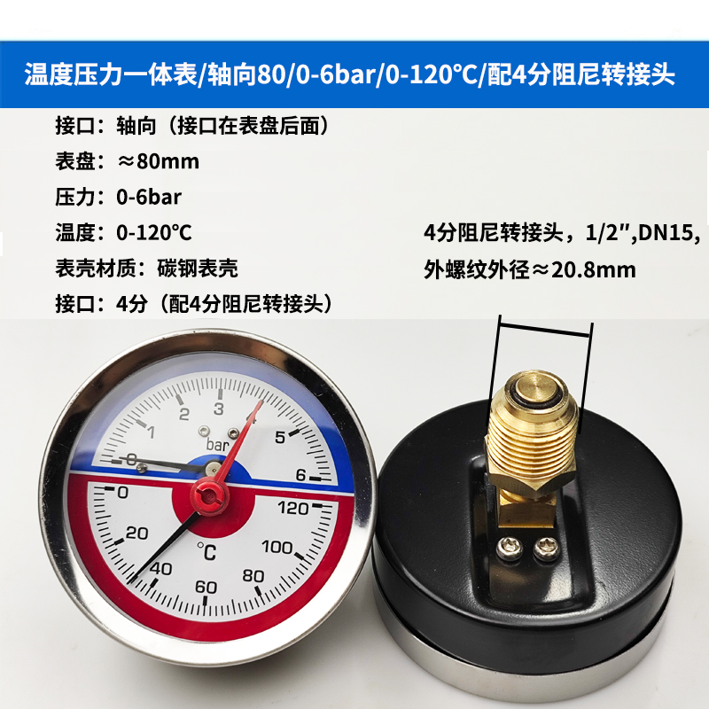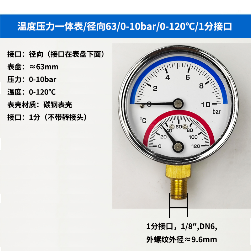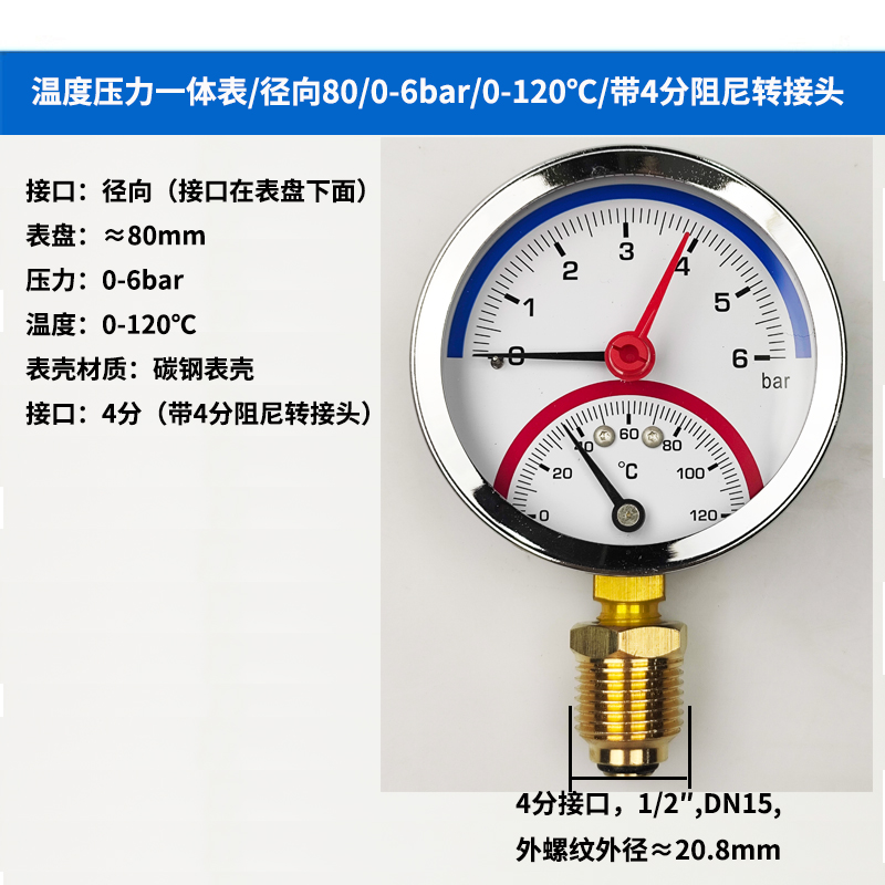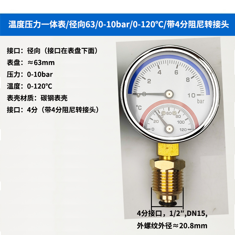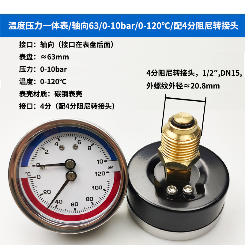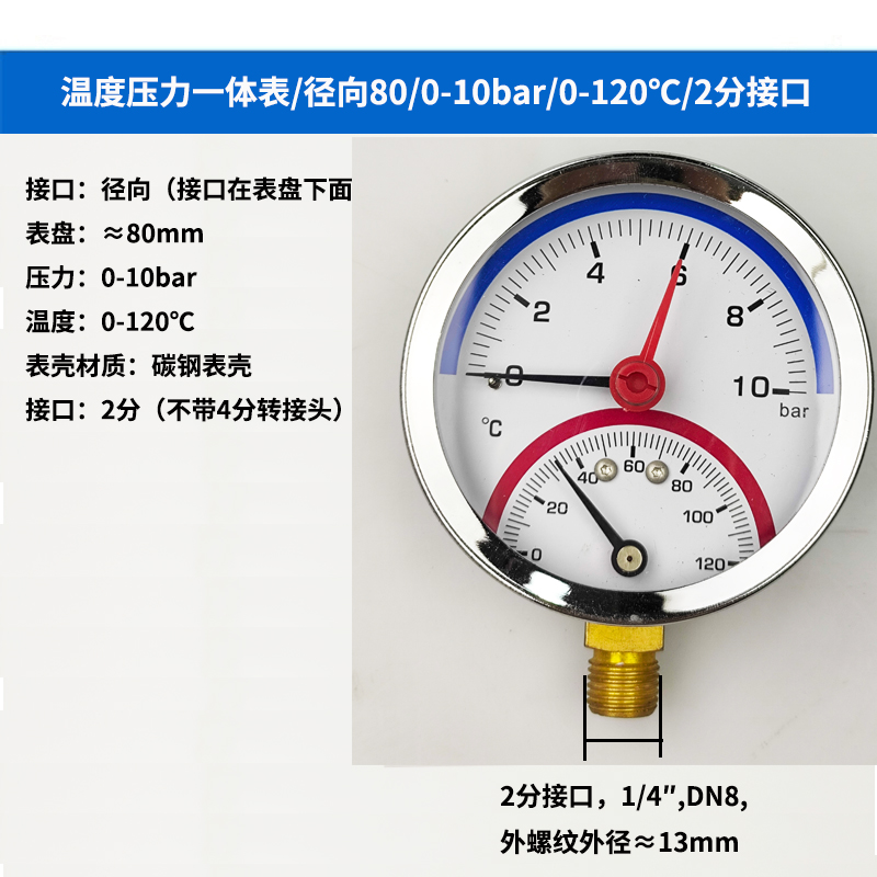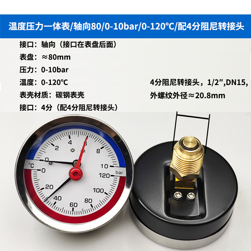 63/80径向温度压力表地暖空调温度压力一体表轴向锅炉水暖温压表