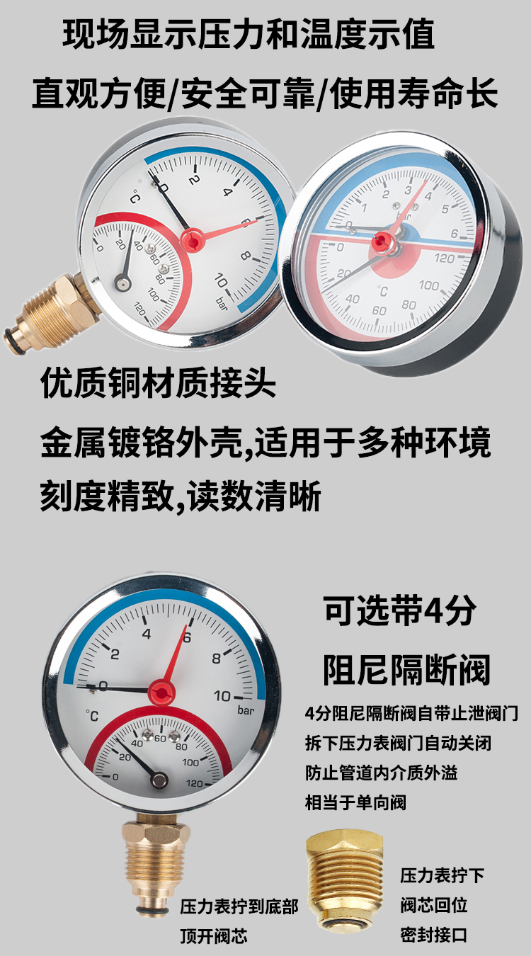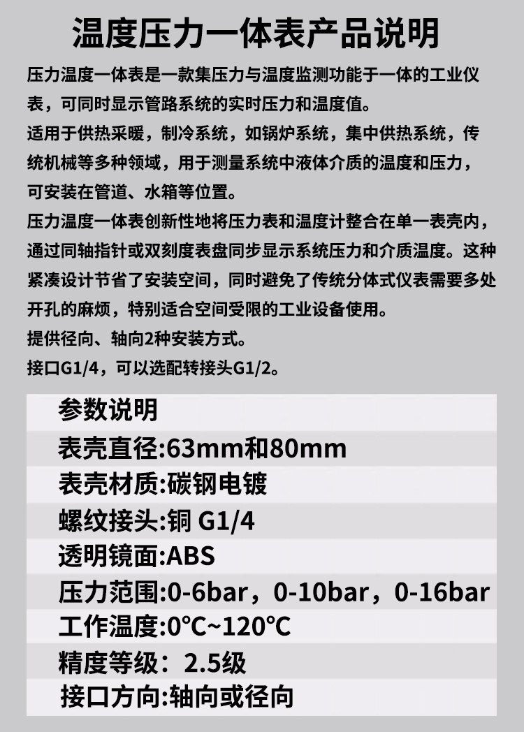 适用于供热采暖,制冷系统,如锅炉系统,集中供热系统,传统机械等多种领域,用于测量系统中液体介质的温度和压力,可安装在管道、水箱等位置。