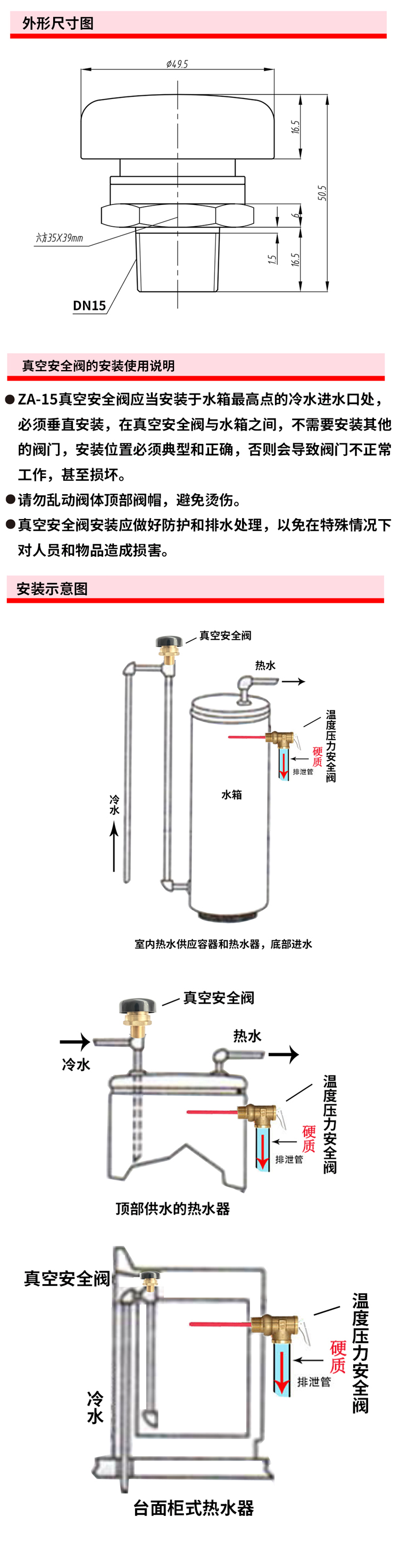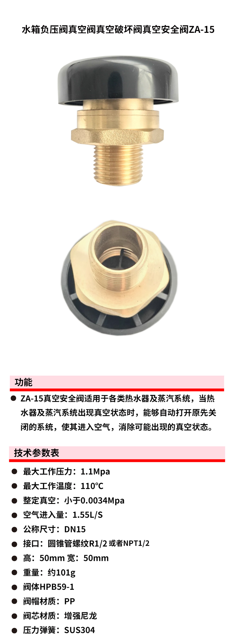ZA-15真空安全阀适用于各类热水器及蒸汽系统,当热水器及蒸汽系统出现真空状态时,能够自动打开原先关闭的系统,使其进入空气,消除可能出现的真空状态。