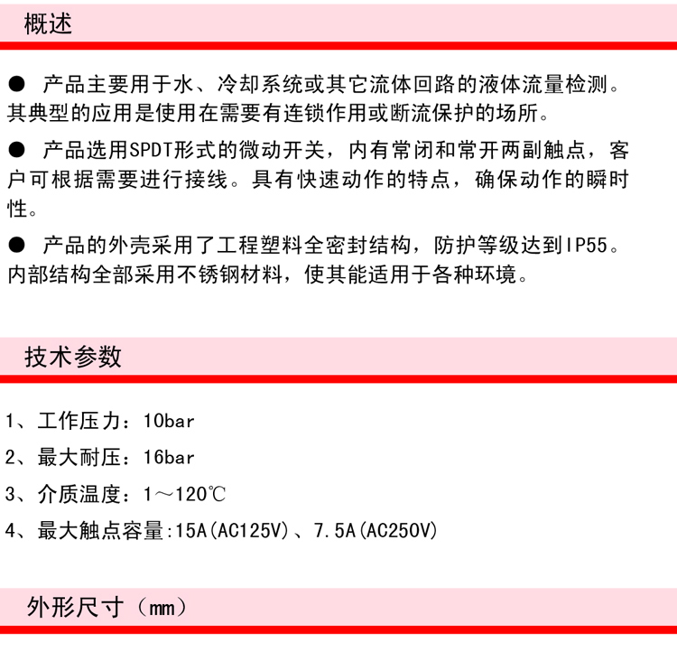气液两用型,可广泛应用于工业自动化/机械设备/空气压缩工业/制冷及空调领域,工业场合具体应用在水冷焊机、激光设备冷却系统、真空镀膜机、电炉、多晶硅铸锭炉等。水流开关磁体不在流动的水道里,可用于污水系统中且能正常工作。